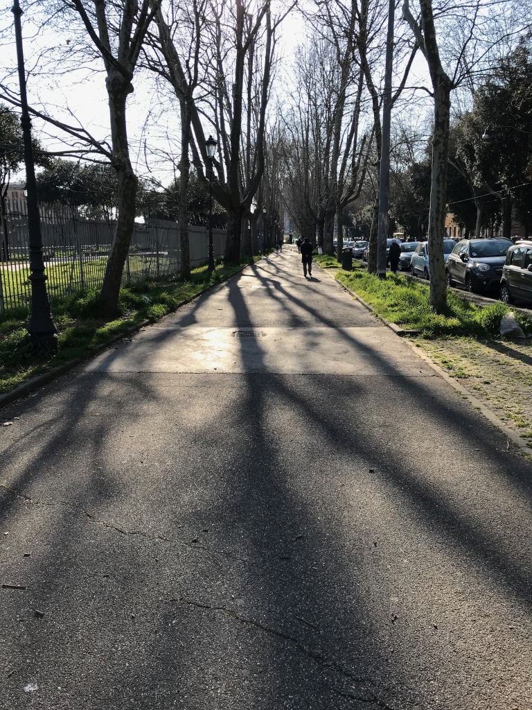 La foto 4 è viale Carlo Felice e mostra un pieno e un vuoto: al di là della cancellata c’è un giardino lineare piuttosto frequentato da bambini, persone con il cane (ci sono 3 diverse aree cani) e anche persone che vanno a correre. Ovviamente diminuiti, gli utilizzatori del parco si sono spostati su questo marciapiede che lo costeggia, normalmente vuoto.